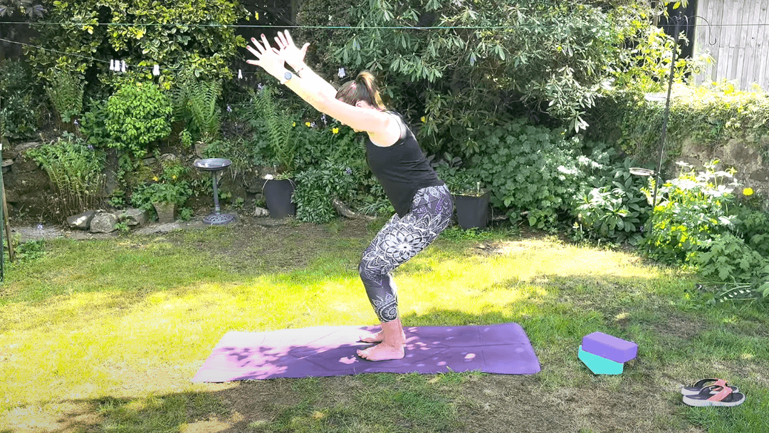 Strength meets surrender. Learn how to engage your legs safely in Chair Pose, then release tension in the spine and hamstrings with a supported Forward Fold.